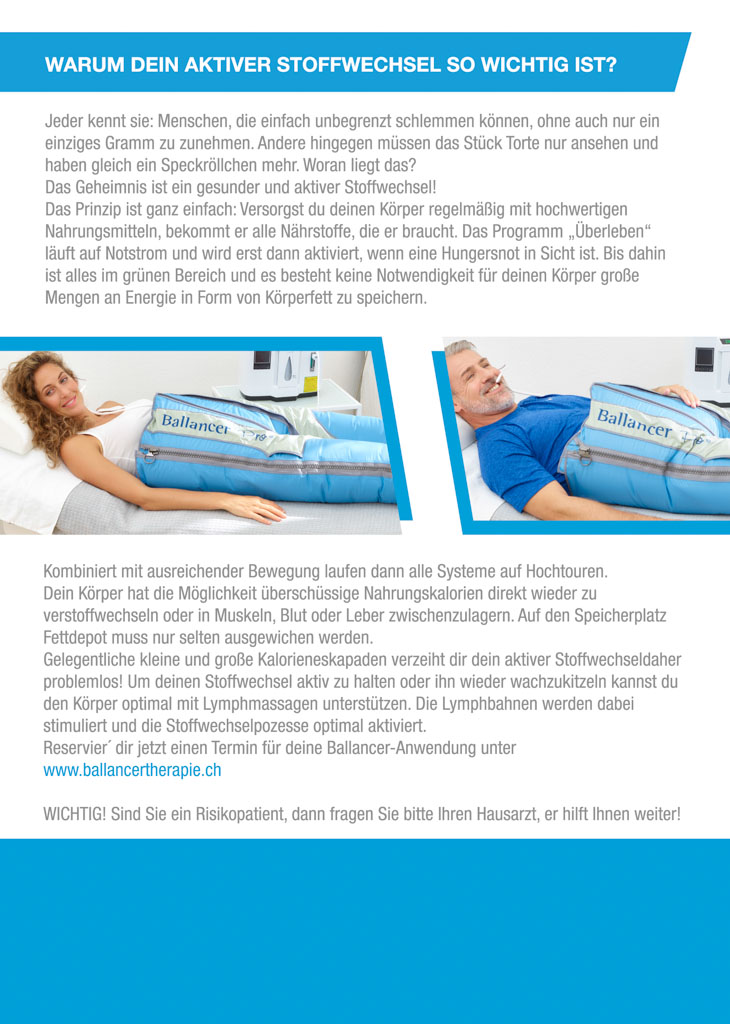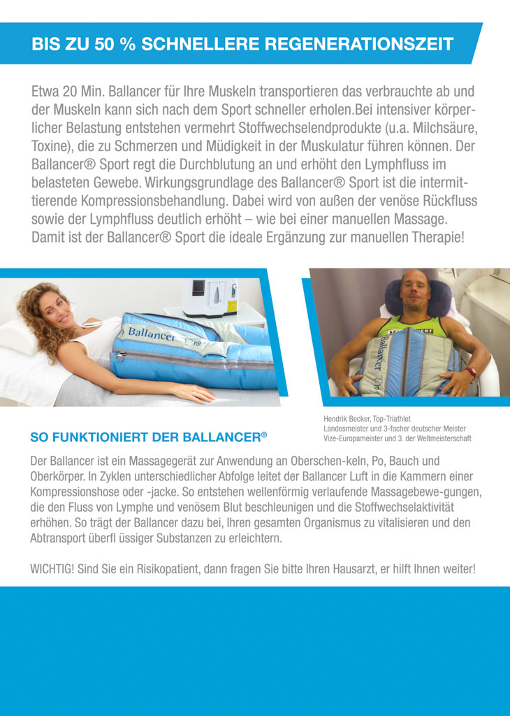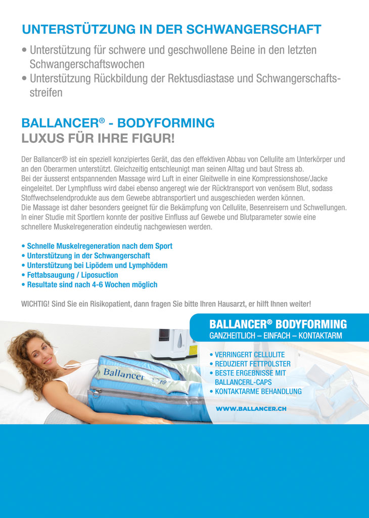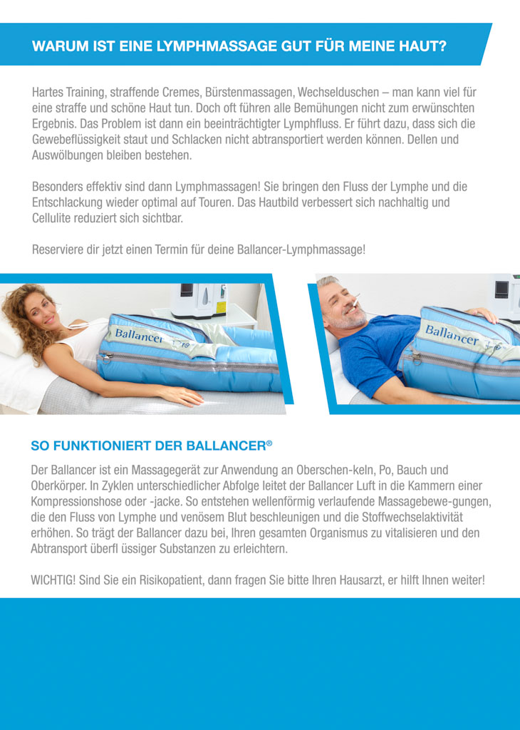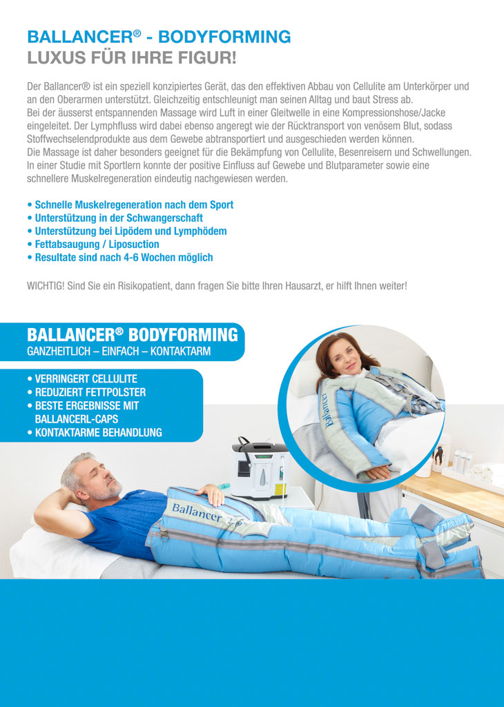 Der Ballancer® ist ein speziell konzipiertes Gerät, das den effektiven Abbau von Cellulite am Unterkörper und an den Oberarmen unterstützt. Gleichzeitig entschleunigt man seinen Alltag und baut Stress ab. Bei der äusserst entspannenden Massage wird Luft in einer Gleitwelle in eine Kompressionshose/Jacke eingeleitet. Der Lymphfluss wird dabei ebenso angeregt wie der Rücktransport von venösem Blut, sodass Stoffwechselendprodukte aus dem Gewebe abtransportiert und ausgeschieden werden können. Die Massage ist daher besonders geeignet für die Bekämpfung von Cellulite, Besenreisern und Schwellungen.